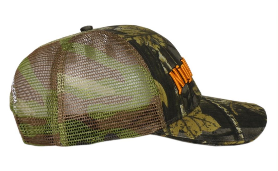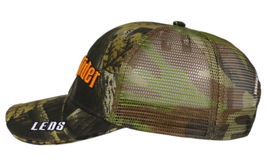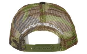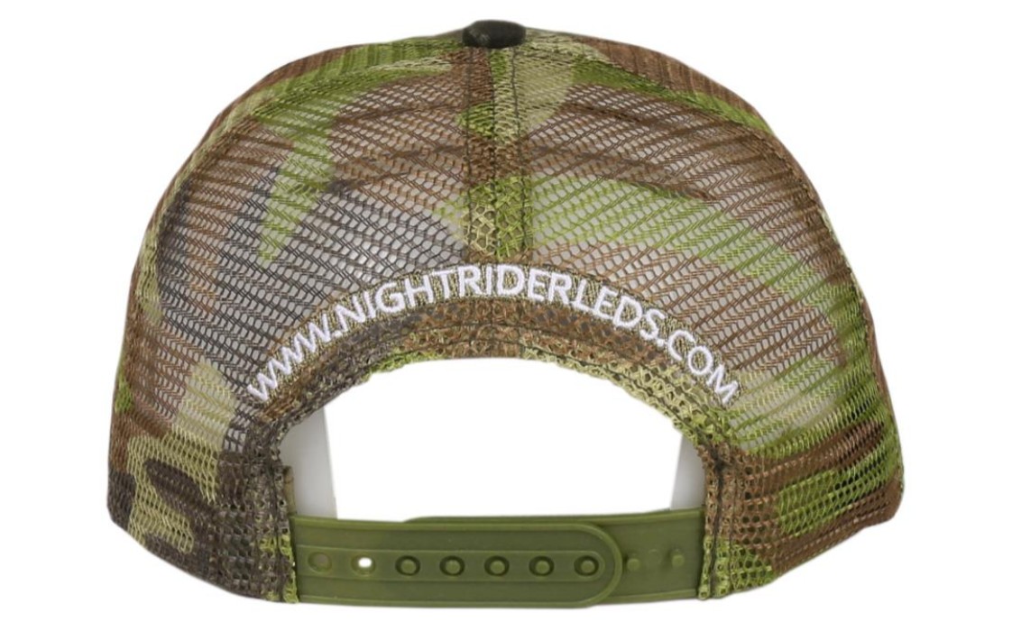 NightRider Camo Trucker Hat with 5 built-in LEDs in the bill of the cap, with a mesh back and adjustable strap.