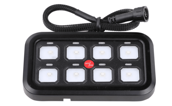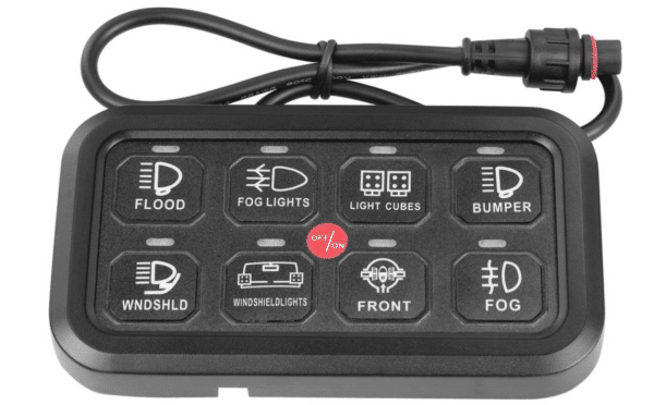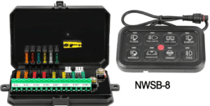 The Universal 8 Gang Switch Panel (NWSB-8) simplifies the control of your extra lighting or accessories with a central On/Off button and a fully customizable control panel. This compact kit includes everything you need for an easy installation—wiring, hardware, fuses, and more—without the hassle of complex wiring or cutting holes in your vehicle.